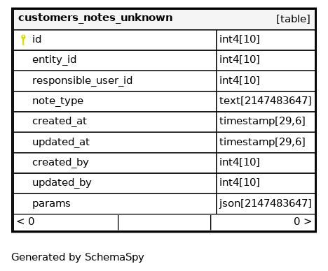 | customers_notes_unknown_pkey | Primary key | Asc | id |